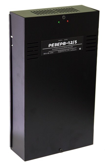 Источник вторичного электропитания резервированный импульсный РЕЗЕРВ-12/5 предназначен для обеспечения бесперебойного электропитания средств охранно-пожарной сигнализации, видеонаблюдения и других потребителей номинальным напряжением 12В постоянного тока.