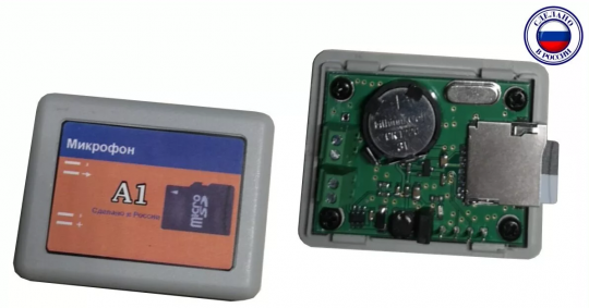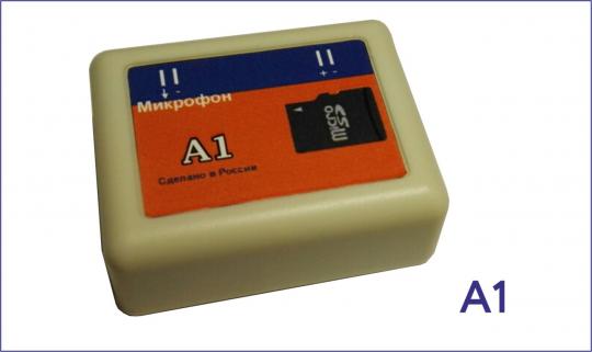 Источник аудиосигнал подключается к специальному разъему, на плате аудиорегистратора. Рядом расположен разъем для подключения питания устройства 12В. Назначение контактов указано на корпусе аудиорегистратора А1.