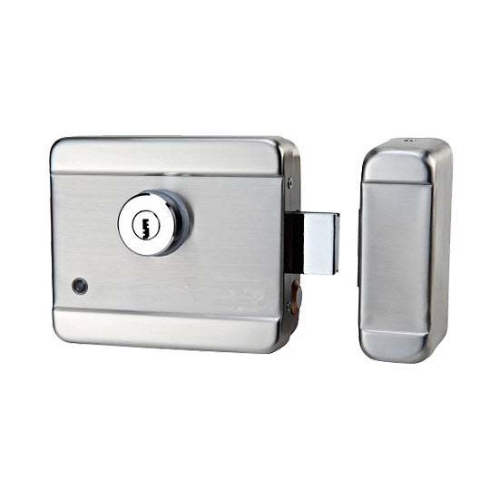 Замок электромеханический, накладной тип монтажа, эксплуатация внутри помещений и на открытом воздухе, нормально-закрытый, универсальный, ключ-кнопка, световая/звуковая индикация, корпус нержавеющая сталь, 12VDC/4W, -30...+50°С, (L)120х(W)102х(H)35mm